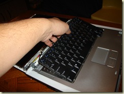 Once the screws are off (2), the keyboard can be removed. To me, this was the trickiest part. I did not know how hard to pull the keyboard, it took me some time to get the courage to pull hard. The keyboard must be lifted like shown in the picture below. Be really careful not to undock any of the keys, they are very very delicate.